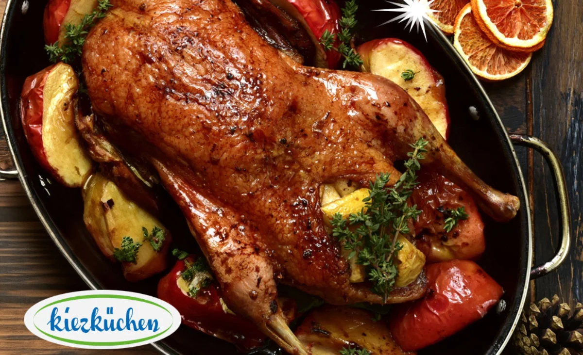 Genießen Sie die Festtage stressfrei mit einer köstlichen Weihnachtsgans der Kiezküchen für Zuhause – frisch zubereitet, knusprig und tafelfertig.